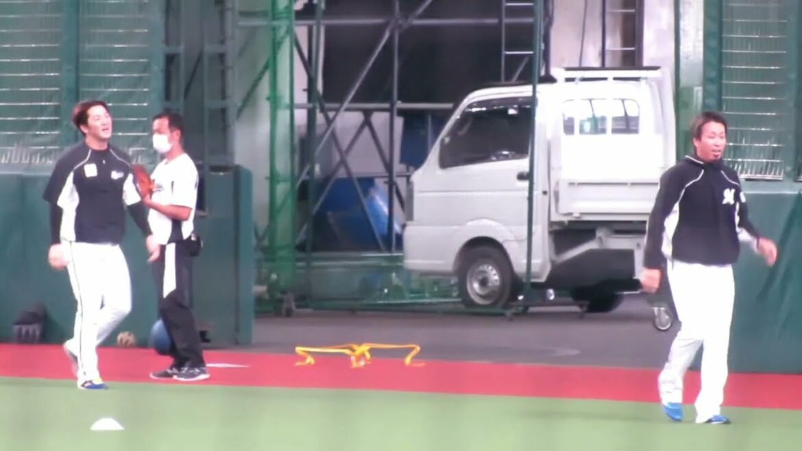 益田直也選手と小野郁選手。走って競争。益田選手さすが速い。マリンで流れるクイズで荻野貴司選手に「いつも勝てない」と言われてた通りの実力です