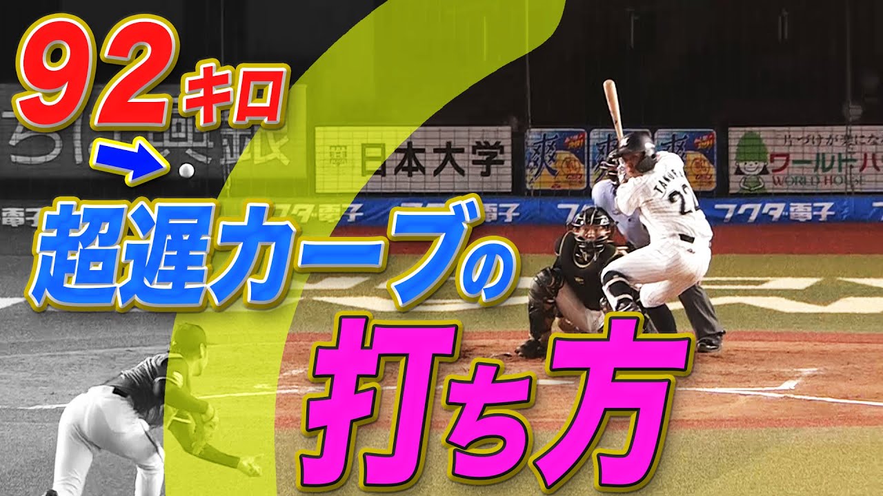 昨日の試合、千葉ロッテ・田村龍弘が超スローカーブを捉えヒットに!なんとその球速92キロ、横からのアングルで見るとタイミングをずらしてミートしている…。巧打をマルチアングルで。