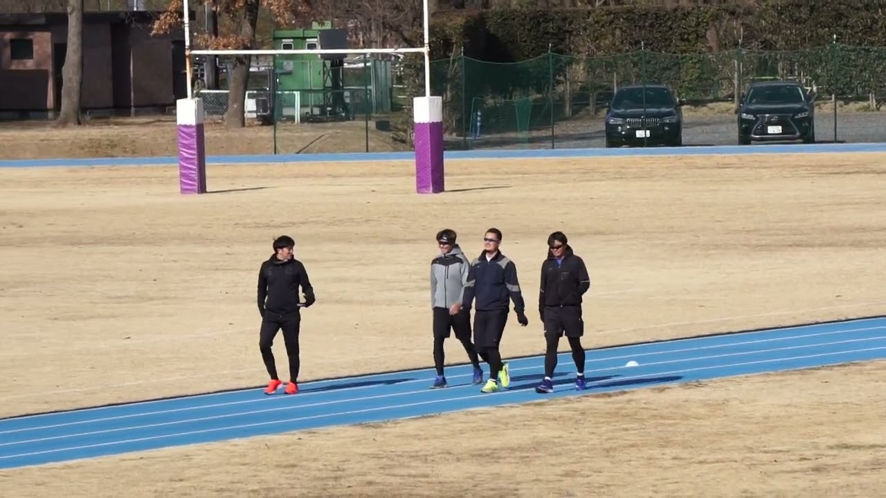 練習前 ウォーミングアップをする奥川恭伸投手、杉山晃基投手、近藤弘樹投手、鈴木裕太投手(東京ヤクルトスワローズ)。