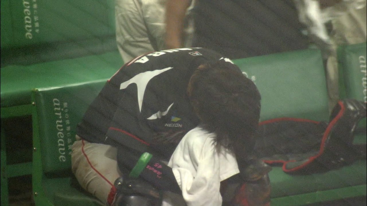 延長10回の末、2対3でサヨナラ負けを喫した千葉ロッテ。試合終了後、田村龍弘がベンチでうなだれている様子があった。(2015年10月14日 福岡ソフトバンクホークス対千葉ロッテマリーンズ)
