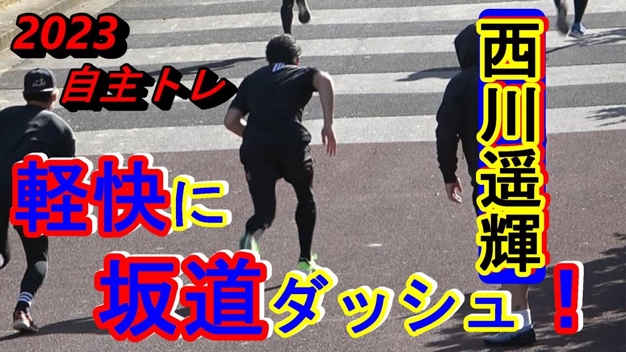 2023年2月1日のプロ野球キャンプ入りを前に沖縄で自主トレを行う東北楽天ゴールデンイーグルスの西川遥輝選手他。軽快に坂道ダッシュ!