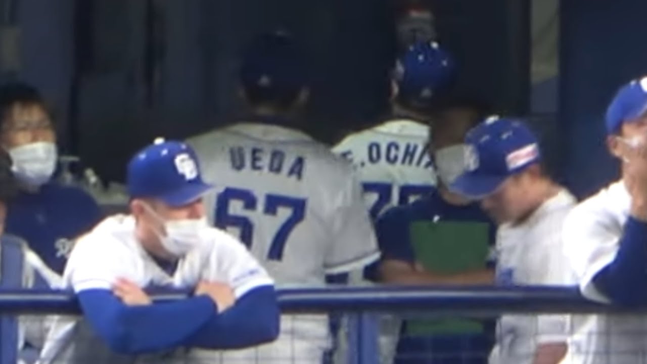 いきなり失点した初回終了後、落合英二コーチに通路奥へと呼び出される上田 (2022/06/01)