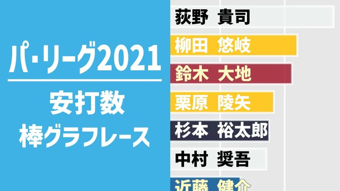 2021年パ・リーグのレギュラーシーズン全日程終了に伴い、安打数推移を動くグラフにしました。 【再生リスト】 【免責事項】 全選手のデータを入力しているわけではないので、途中経過(特に序盤)の順位は必ずしも実際の並びとなっていない可能性があります。 【ハッシュタグ】 #プロ野球BarChartRace #荻野貴司 #NPB #プロ野球Chiba Lotte MarinesCsikos Postkjozkオリックスバファローズパシフィック・リーグ中村 奨吾千葉ロッテマリーンズ吉田 正尚最多安打杉本 裕太郎東北楽天ゴールデンイーグルス柳田 悠岐栗原 陵矢森 友哉源田 壮亮福岡ソフトバンクホークス荻野 貴司荻野貴司近藤 健介鈴木 大地 NPBHUB.COM | The Fanbase of Nippon Baseball & Nippon Professional Baseball