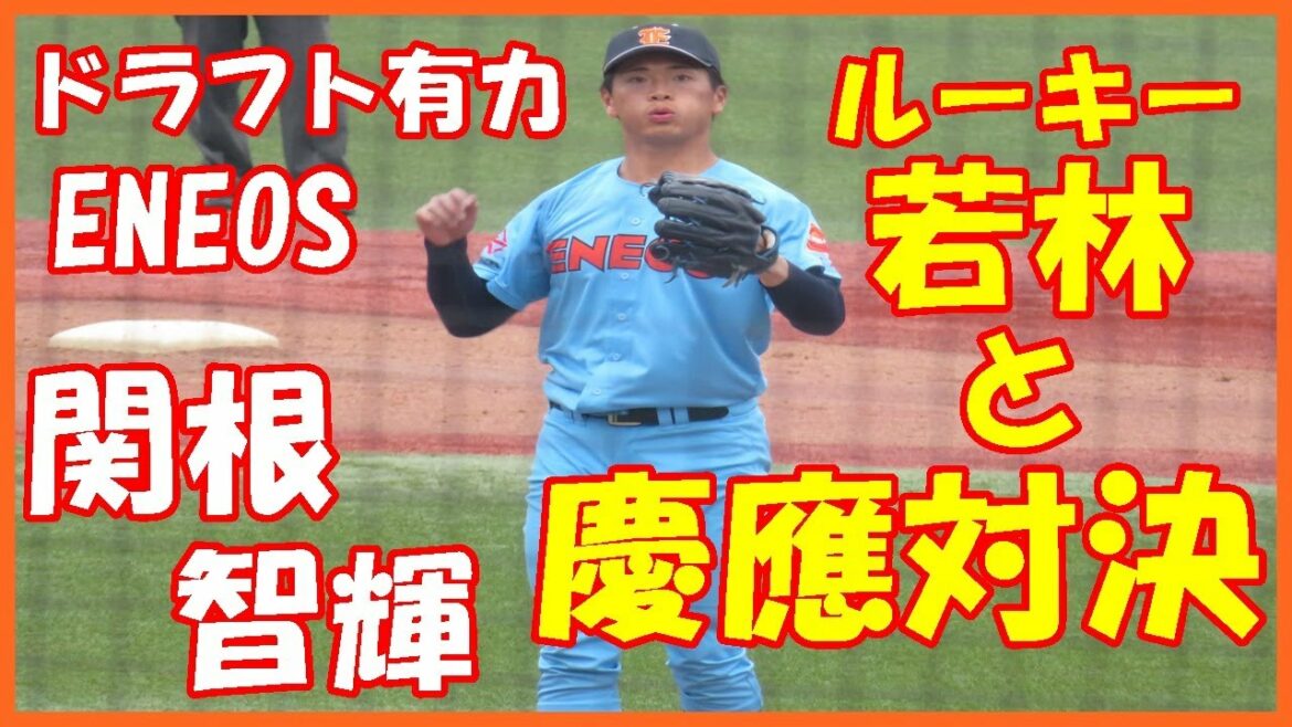 関根投手は抑えの切り札として2イニング2安打無四死球無失点で勝利に貢献した。8回に今大会売り出し中でルーキーながら日本新薬の5番を任され早くも大会2号のホームランを打っている若林将平選手との慶應対決が見られました。1学根先輩の関根投手が内野ゴロに打ち取りました。