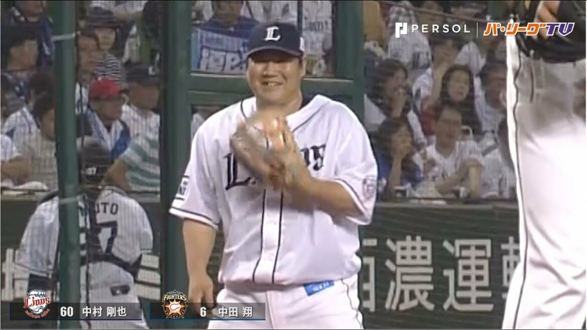 北海道日本ハム・中田翔が放った打球を埼玉西武・中村剛也が好捕。すると中村が笑みを浮かべ、中田はベンチで…