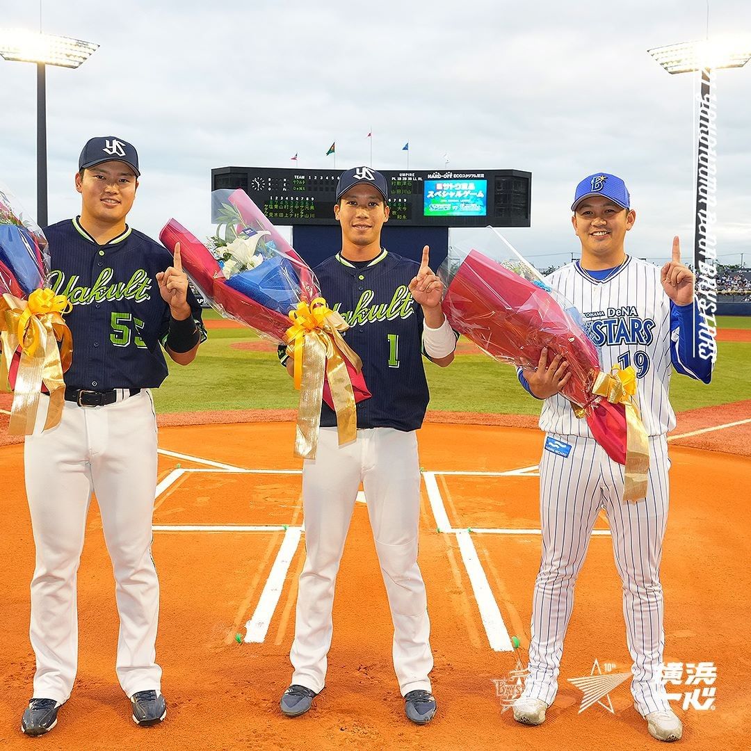. 試合前に東京オリンピックで金メダルを獲得した野球日本代表メンバーの 横浜DeNAベイスターズ #山﨑康晃 選手、 東京ヤクルトスワローズ #山田哲人 選手、#村上宗隆 選手へ 花束の贈呈が行われました . #baystars baystarsNPB Central LeagueOfficial MediaYOKOHAMA DeNA BAYSTARSYOKOHAMA DeNA BAYSTARS Official Media山田哲人山﨑康晃村上宗隆横浜DeNAベイスターズ NPBHUB.COM | The Fanbase of Nippon Baseball & Nippon Professional Baseball