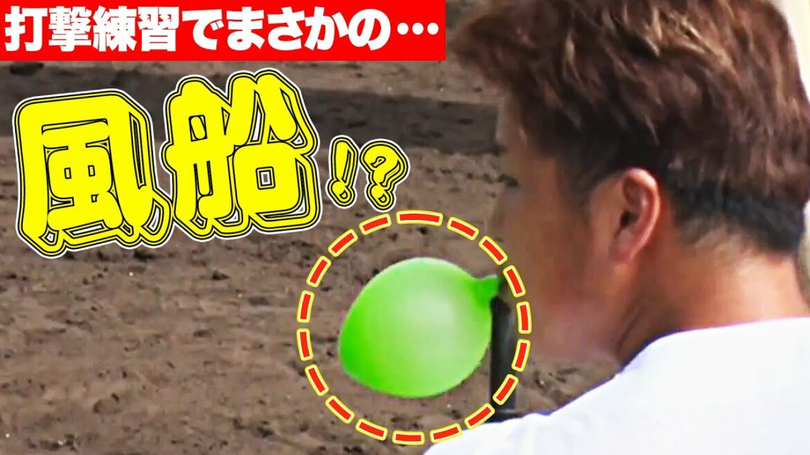 打撃練習に取り組む千葉ロッテ・山口航輝の口には緑色の風船が。これは呼吸のタイミングの練習なのか…斬新な練習法に実況・解説も困惑!?