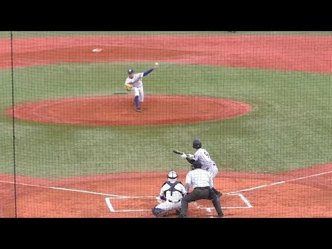 2019年11月18日神宮球場で開催された、第50回明治神宮野球大会・高校の部準決勝、健大高崎高校 vs 白樺学園高校 戦での高崎健康福祉大学高崎高校の先発・下慎之介投手の投球シーン。