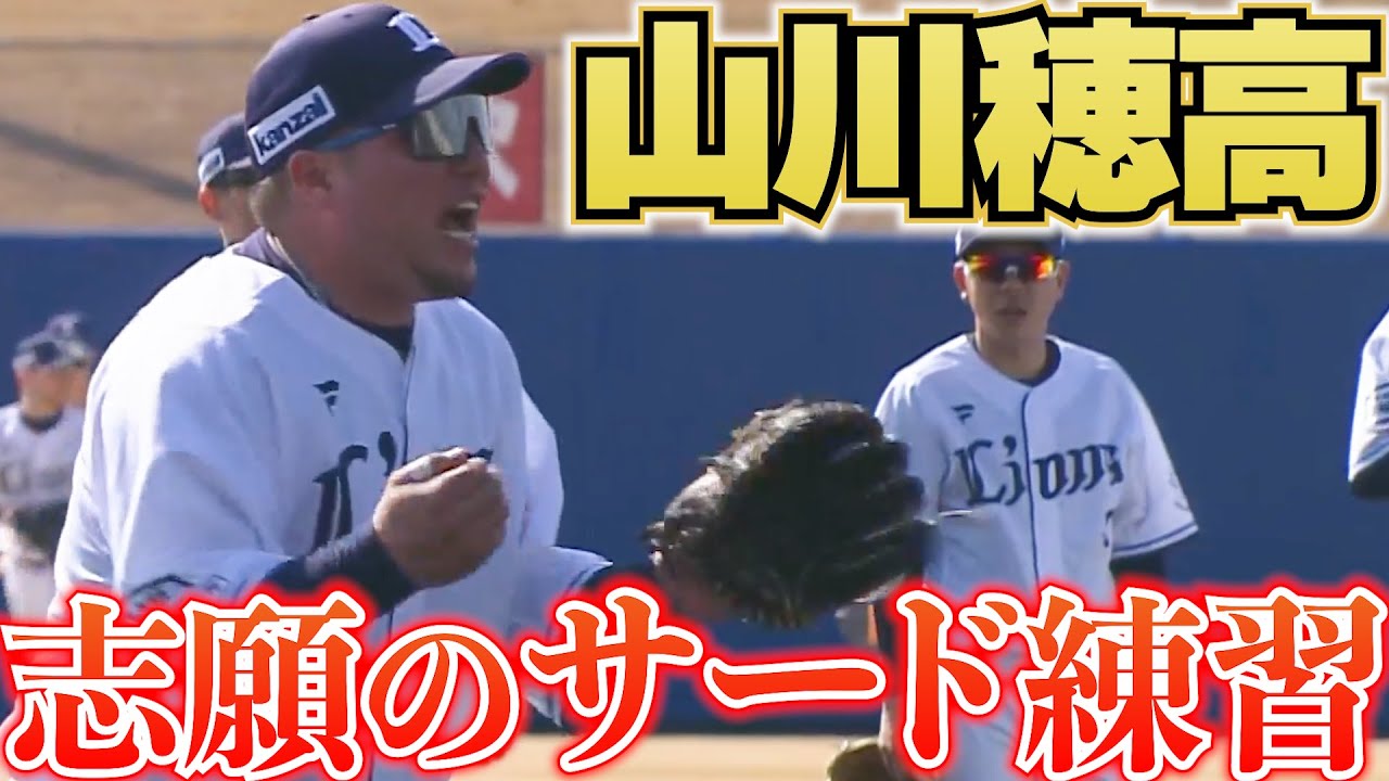 山川穂高が自ら志願し、サードで守備練習に登場しました。