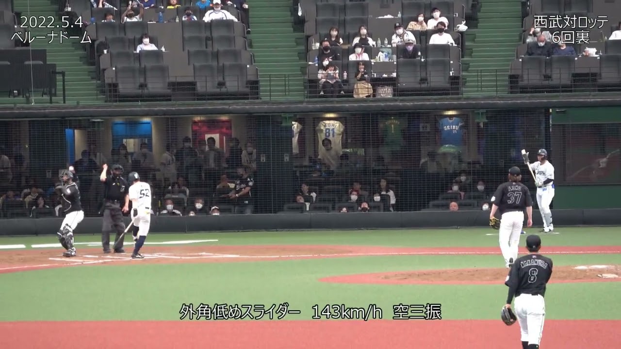2022年5月4日(水)ベルーナドーム 西武対ロッテ 7回戦 6回裏 6番 高木渉選手 カウント0-2 外角高めストレート 154km/h 空三振 7番 山田遥楓選手 カウント1-2 外角低めスライダー 143km/h 空三振 8番 柘植世那選手 内角スライダー 138km/h 見三振 球審は木内審判員 Chiba Lotte Marines千葉ロッテマリーンズ小野郁 NPBHUB.COM | The Fanbase of Nippon Baseball & Nippon Professional Baseball