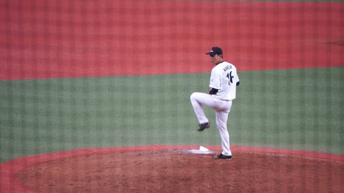 8回表 金田和之投手がマウンドへ投球練習を始める。