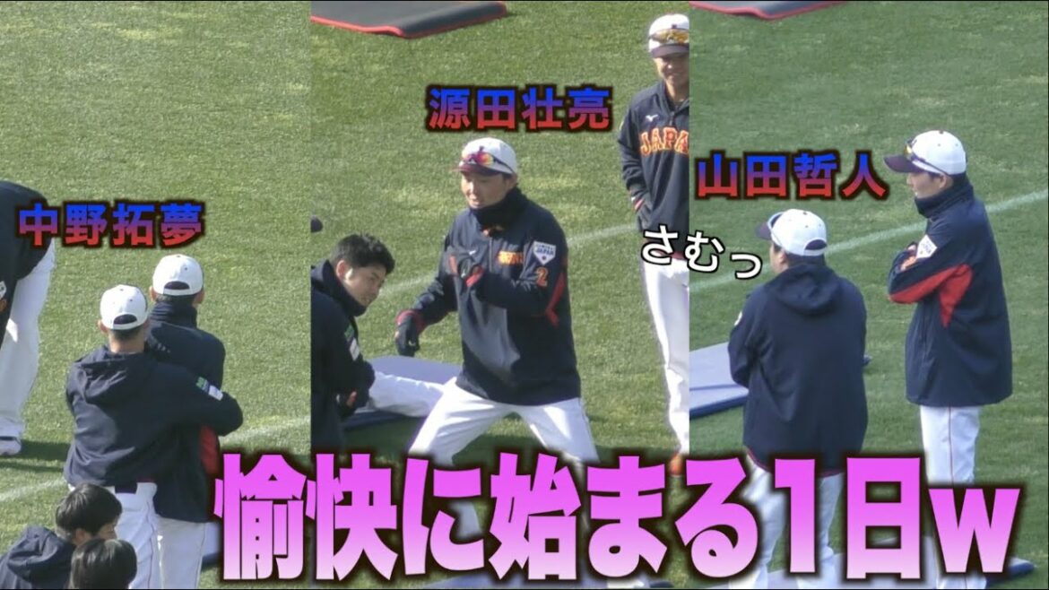 中野拓夢に抱きつかれながら登場する源田壮亮wブルブル震える山田哲人と共にアップ開始!w#日本代表#侍ジャパン#キャンプ#WBC
