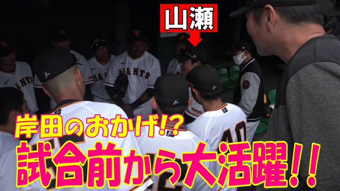 円陣番長・岸田行倫選手のアドバイスを受けながら山瀬慎之助選手が日々成長しています。