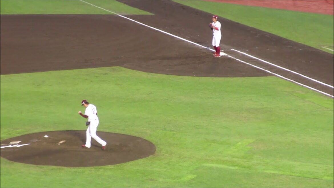 サード側から見た楽天イーグルス・塩見貴洋選手の投球練習と下妻貴寛捕手のスローイング