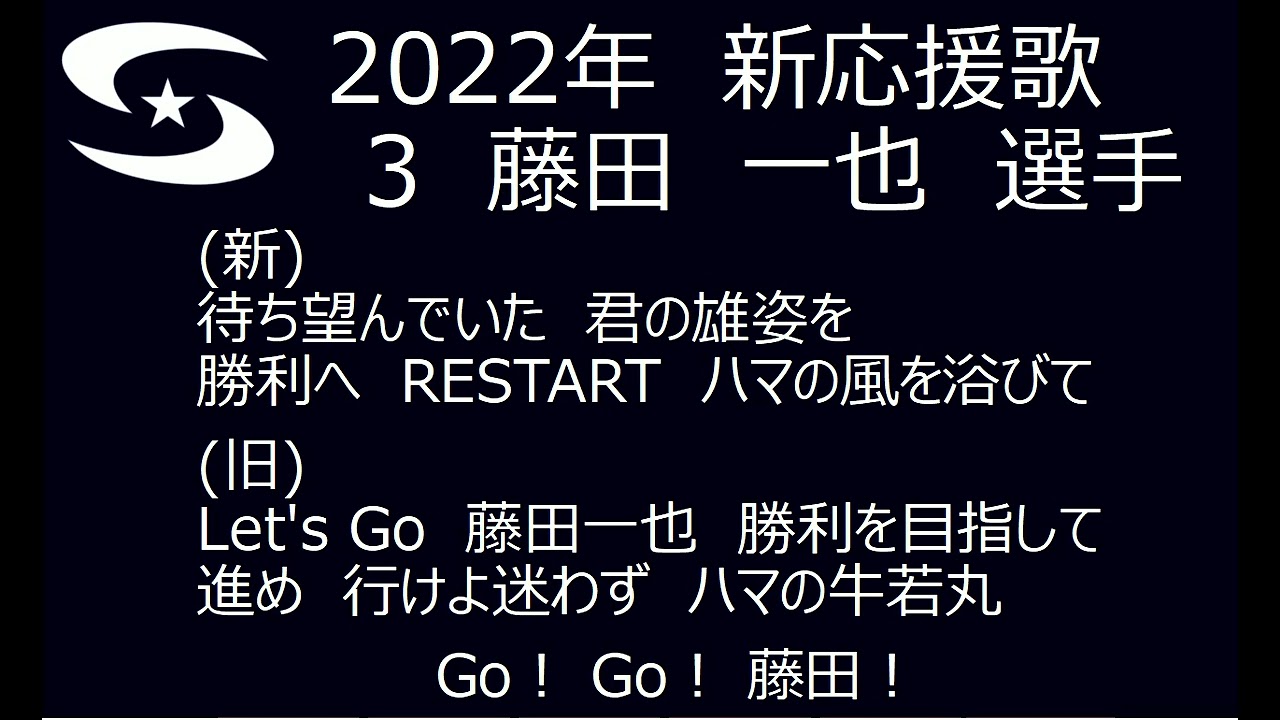 #3 藤田 一也選手の応援歌です。 →新曲と前回在籍時の曲の交互演奏となります。順番は新⇒旧です。 →コールは『Go!Go!フジタ』となります。 DeNATohoku Rakuten Golden Eaglesベイスターズ応援団応援歌星覇会東北楽天ゴールデンイーグルス横浜藤田一也 NPBHUB.COM | The Fanbase of Nippon Baseball & Nippon Professional Baseball