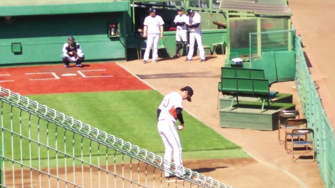 両チームの1-9の応援歌が流れる中でのオリックス先発のK-鈴木投手の投球練習の様子です。