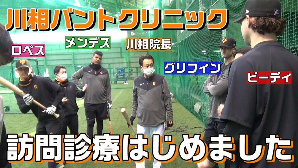 旧室内練習場でバント練習を行うビーディ、グリフィン、ロペス、メンデスの4投手のもとへ、川相昌弘院長が訪問診療しました!
