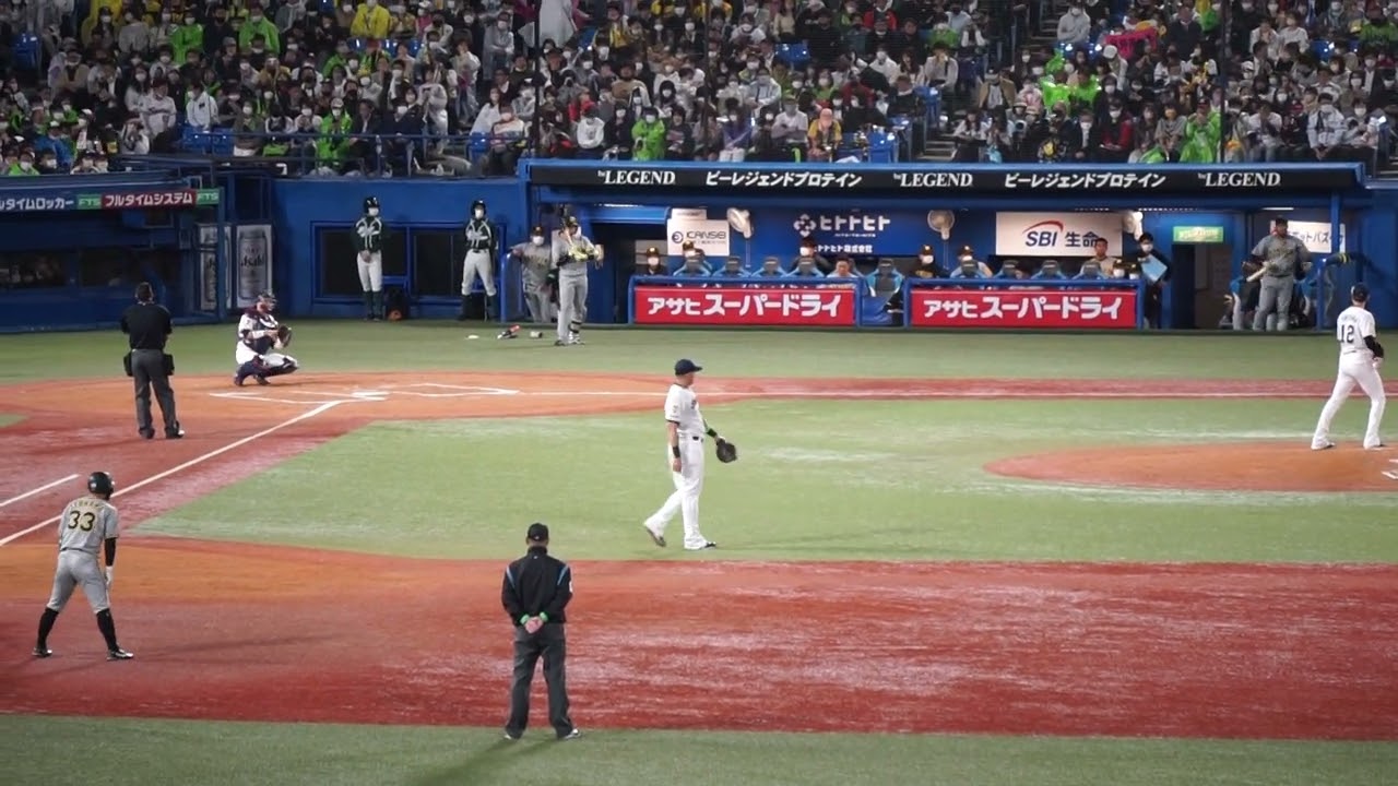 7回表 石山泰稚投手がマウンドへ投球練習を始める。