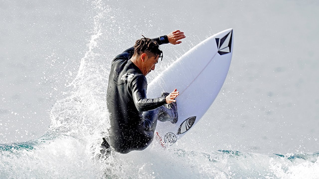 波を駆け上がり、頂点でターン。「オフザリップ」と呼ばれる技はサーフィンでは基本だが、日本代表「波乗りジャパン」の村上舜はひと味違う。普通の選手は斜めに上がっていくが、村上は重力に逆らうかのように、ほぼ垂直に波を駆け上がる。そして、波が一番高い部分で崩れかけるリップと呼ばれる場所で高速ターン。ボードの回転に合わせて、羽が生えたかのように、スプレー(水しぶき)が扇状に高く、大きく舞い飛ぶ。