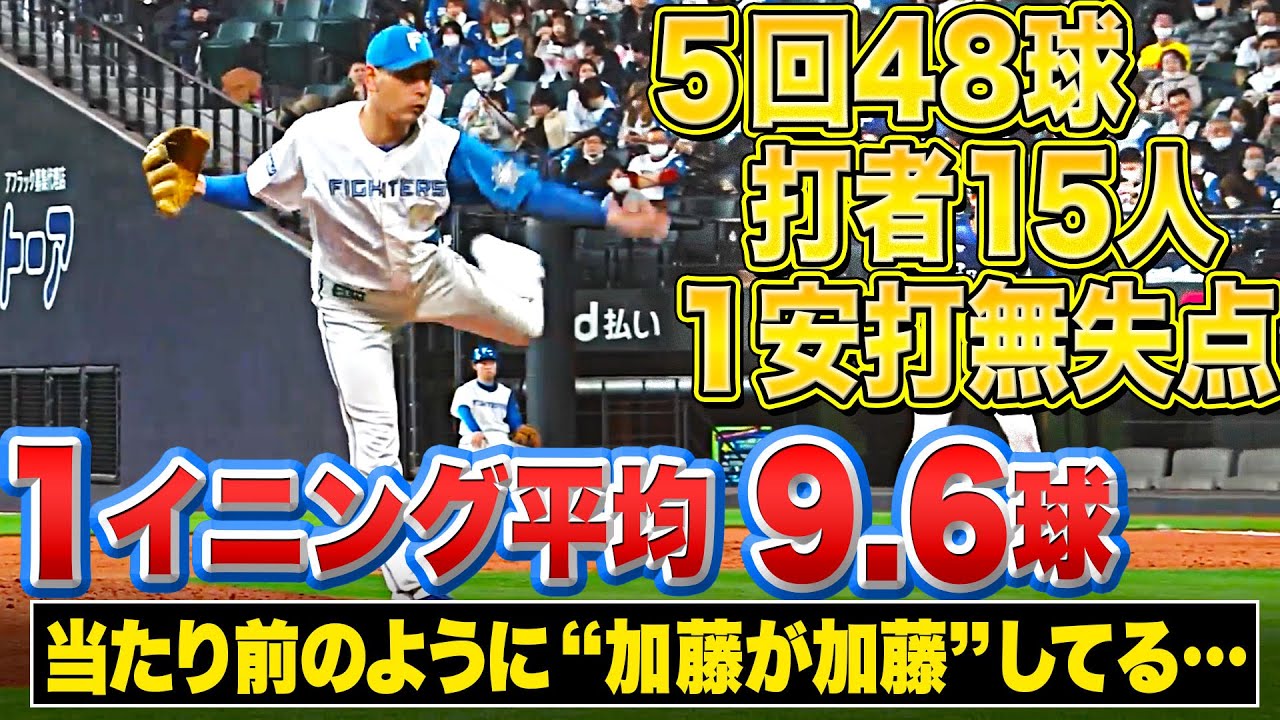 北海道日本ハム・加藤貴之は5回を48球、1安打無失点の好投。与四球は当たり前のようにゼロ。1イニング平均9.6球…!?ということは9回まで投げても86球ですかね。昨年”マダックス”を達成したときは90球だったので計算上ではそれよりも少ない…これはまさに加藤が加藤してる…!! ※一時的に1イニング平均9.2と表示しておりましたが、文系が計算して、文系がそれを信じてアップしたので、誤表示となっておりました。正しくは9.6となります。どうか、文系の我々を責めないでいただけますと幸いです。訂正して言い訳申し上げます。