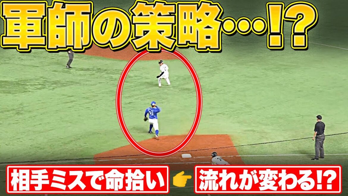 5回、これぞ『軍師の策略』と言えるシーンが。ヒットで出塁した福岡ソフトバンク・三森大貴が牽制球に誘い出されて飛び出してしまう…も、相手のミスが絡み挟殺プレーは免れる結果に。このプレーが生きたか、チームは追加点を奪う!『軍師の策略』で流れがホークスに…!?