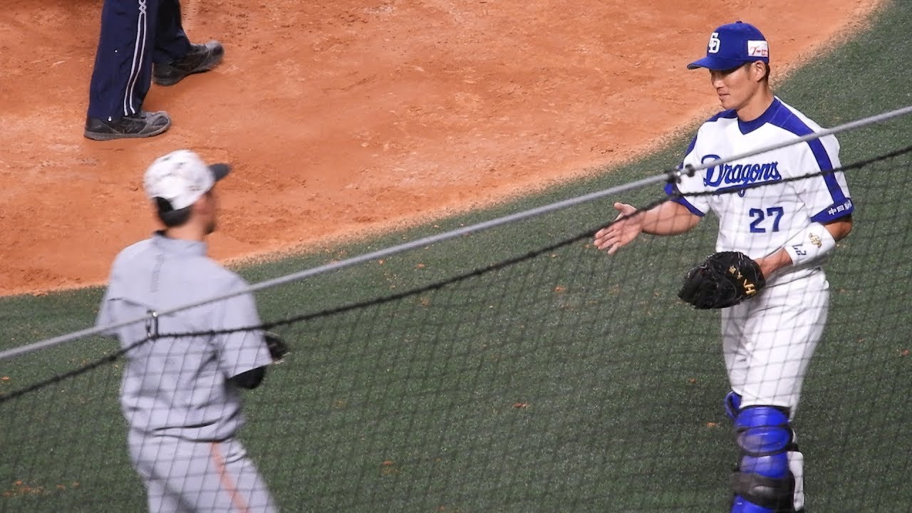 2018/09/01撮影。元ファイターズの仲間が多い巨人戦。吉川君には自ら手を差し出していました。ピッチャーには手厚い丁寧に接するsタイル。