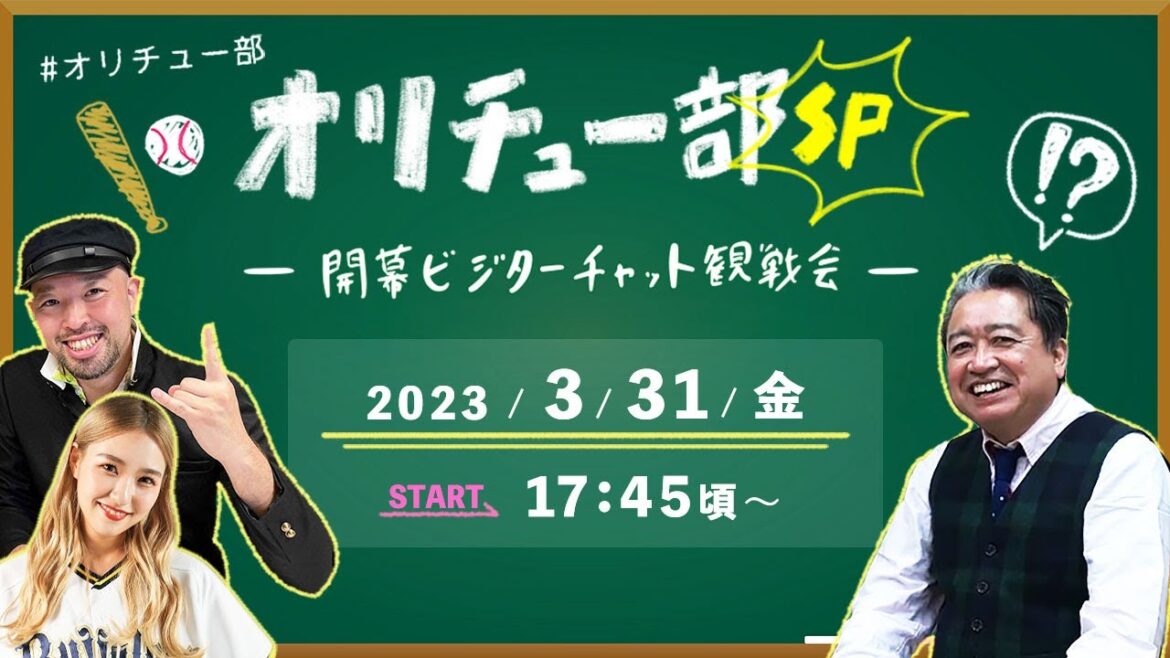3月31日(金)いよいよ開幕戦!ビジターゲームとなる開幕戦をファンみんなで応援するべく、オリチュー部SP版「開幕ビジターチャット観戦会」を生配信いたします。今回も学級委員長の神戸佑輔さん、日直にはBsGirls SAAYAが新しく担当、そして特別に教頭先生の大前一樹さんも参加して熱く完全オリびいきの実況!みなさんと一緒になってオンライン観戦を盛り上げていきます!!
