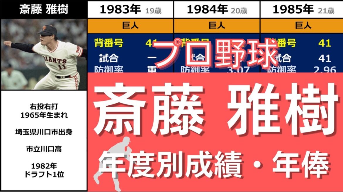 1982年のドラフト会議にて読売ジャイアンツから1位として指名を受け、入団した斎藤雅樹投手のプロ野球での成績です。