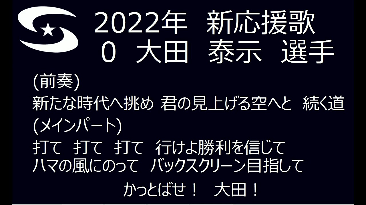 #0 大田 泰示選手の応援歌です。 →前奏(新曲)から流用応援歌(石井浩郎選手)の流れとなります。 →前奏は各打席1回のみ演奏します。 →代打出場の際は、代打の応援歌は使用せず、前奏から入ります。 DeNAHokkaido Nippon-Ham Fightersベイスターズ北海道日本ハムファイターズ大田泰示応援団応援歌星覇会横浜 NPBHUB.COM | The Fanbase of Nippon Baseball & Nippon Professional Baseball