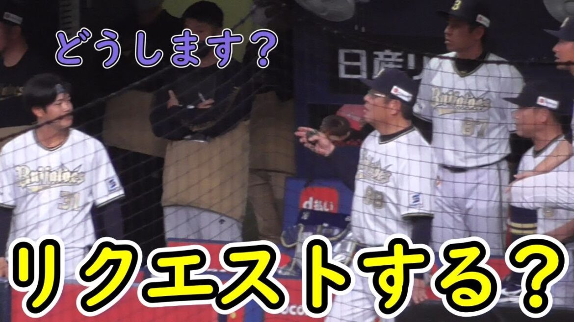 森友哉選手のセンターへの大きな当たりを江越大賀選手がフェンスに激突しながらキャッチ。リクエストを要求する選手と、様子を探り合うオリックスベンチの様子。