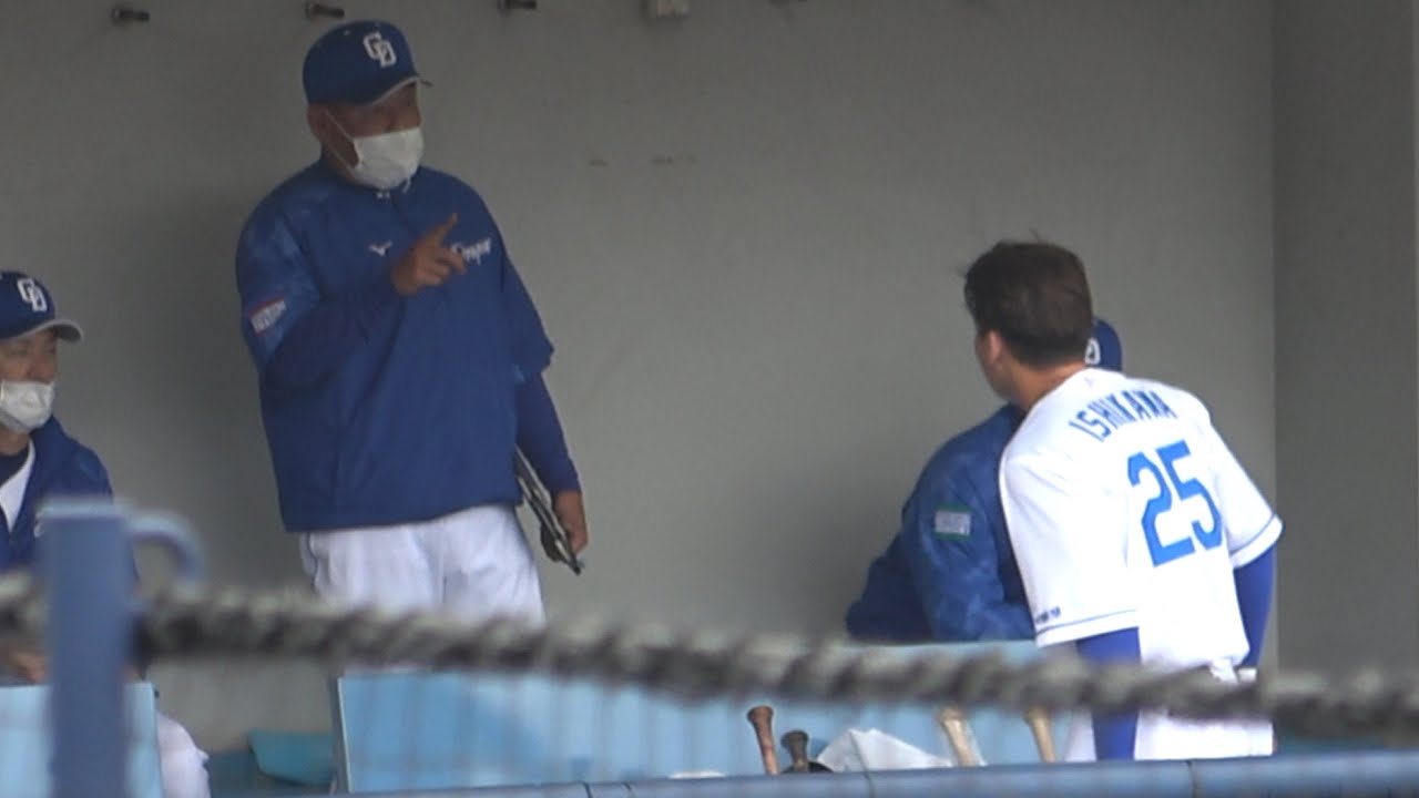 石川昂弥の2打席目は右飛!予定の2打席を終えて片岡監督や中村ノリコーチと笑顔で話す (2023/04/06)