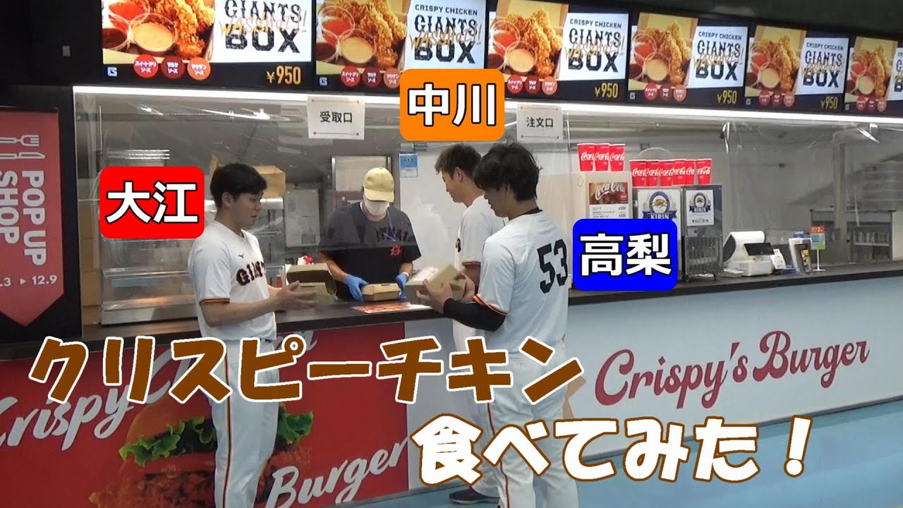クリスピーチキン専門店「Crispy’s Burger(クリスピーズバーガー)」が東京ドーム場内の1階グルメストリート(一塁側)にオープン!特別メニュー「CRISPY CHICKEN GIANTS WASSHOI!! BOX」を高梨雄平、中川皓太、大江竜聖の3投手が試食しました!選手たちのおススメのソースは?