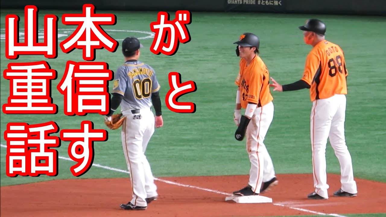 山本泰寛が東京ドームに凱旋!重信が3塁に到達、山本泰寛が元同僚 重信慎之介と話していました。