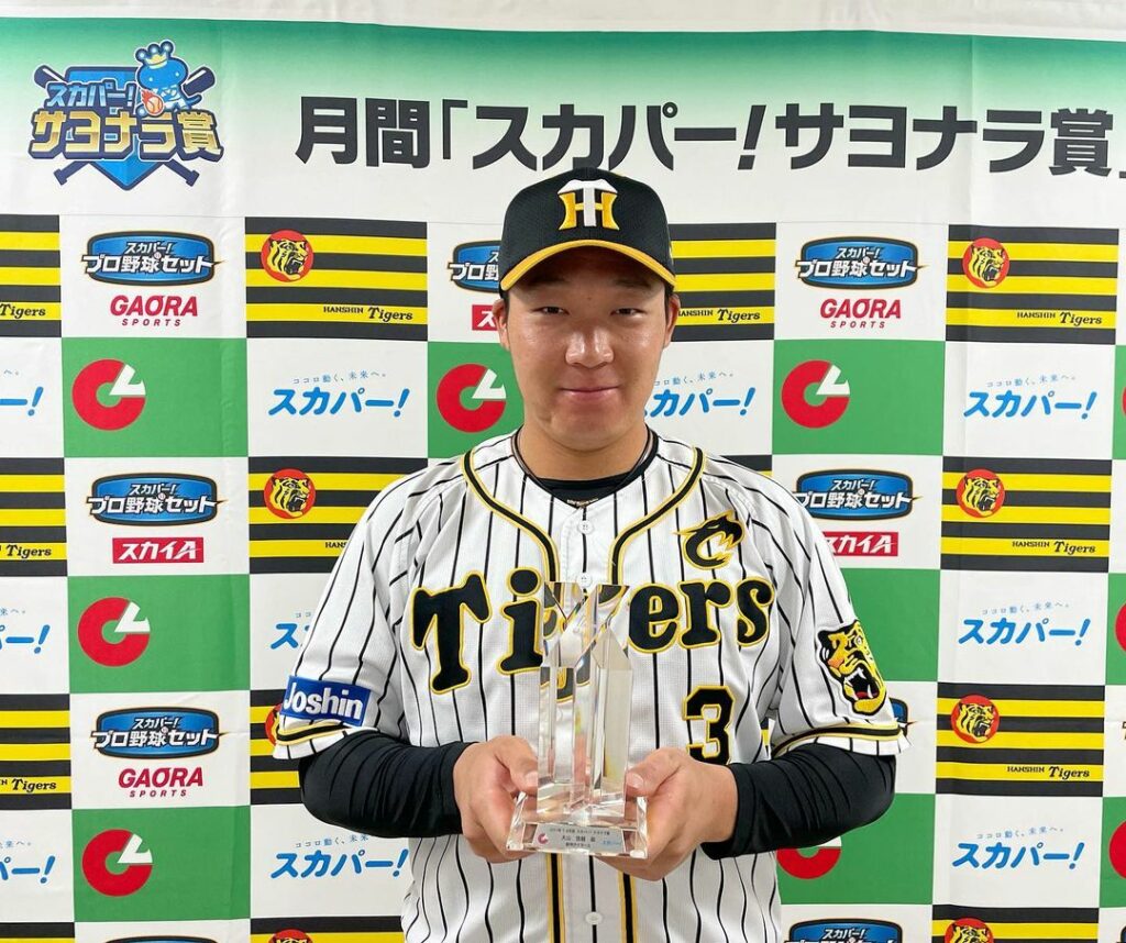 大山選手が7・8月度月間「スカパー!サヨナラ賞」(セ・リーグ)を受賞しました!おめでとうございます👏#大山悠輔 選手#スカパーサヨナラ賞 7.8月 #npb7月12日対DeNA戦3点を追う9回裏三者連続タイムリーで同点に追いついた後、2アウト1.3塁からセンターへサヨナラヒット!#阪神タイガース #挑超頂 Hanshin TigersHanshin Tigers Official MediaNPBNPB Central LeagueOfficial Mediaスカパーサヨナラ賞大山悠輔挑超頂阪神タイガース NPBHUB.COM | The Fanbase of Nippon Baseball & Nippon Professional Baseball