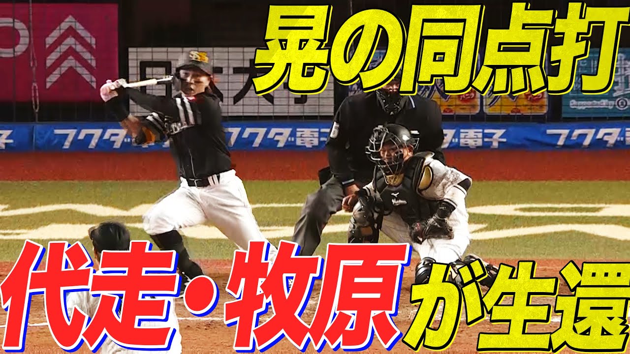 福岡ソフトバンク・中村晃が右中間へ同点のタイムリー2ベースヒット!! 代走で出場した1塁ランナー・牧原大成も驚異の生還率です。