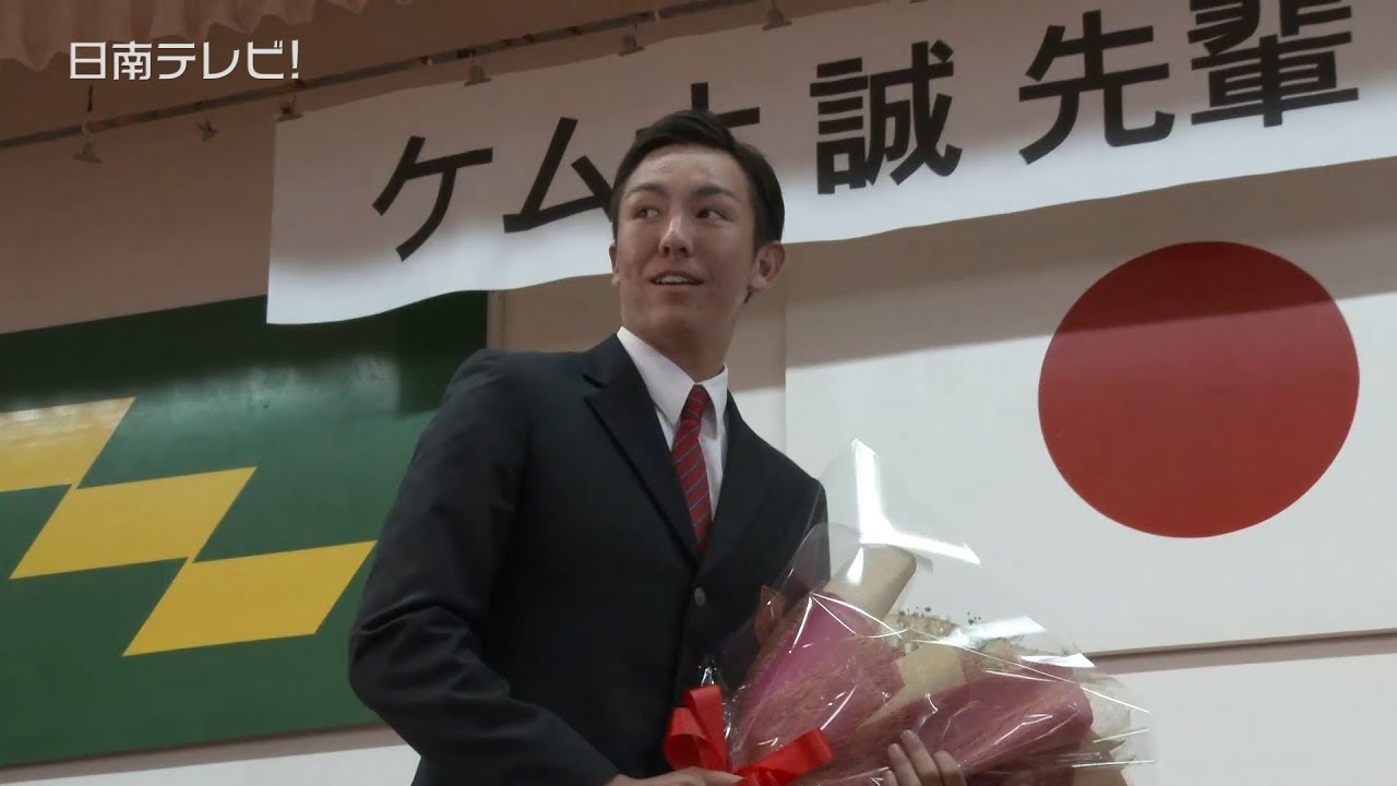 生徒代表の島山凌弥さんは「日南高校からケムナ先輩のような日本そして世界にはばたく先輩が誕生したことに後輩として誇りに思います。ケムナ先輩がキャンプに来る際は絶対に応援に行きたいと思います」と激励の言葉を述べました。