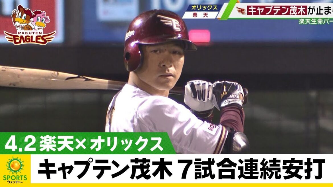 楽天打線を引っ張るのは、開幕から全試合安打中の茂木栄五郎。オリックス・ヒギンスから7試合連続安打となるタイムリー。打率5割に迫る、頼れるキャプテンが楽天を勝利に導いた。