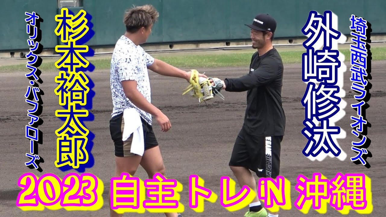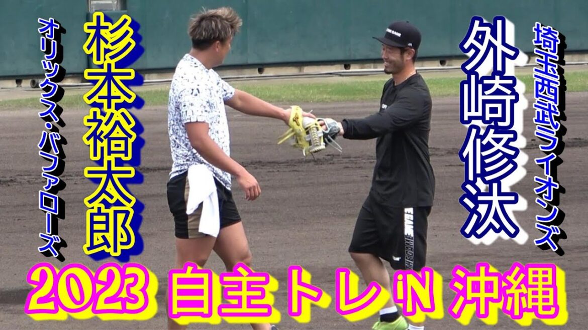 2023年2月1日のプロ野球キャンプ入りを前に沖縄で合同自主トレを行うオリックス・バファローズ の杉本裕太郎選手と埼玉西武ライオンズの外崎修汰選手。キャッチボール!