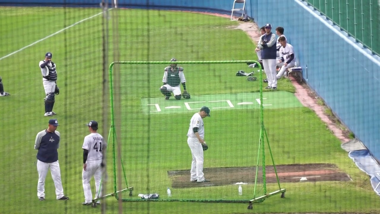 8回表 大西広樹投手がブルペンで投球練習を始める。