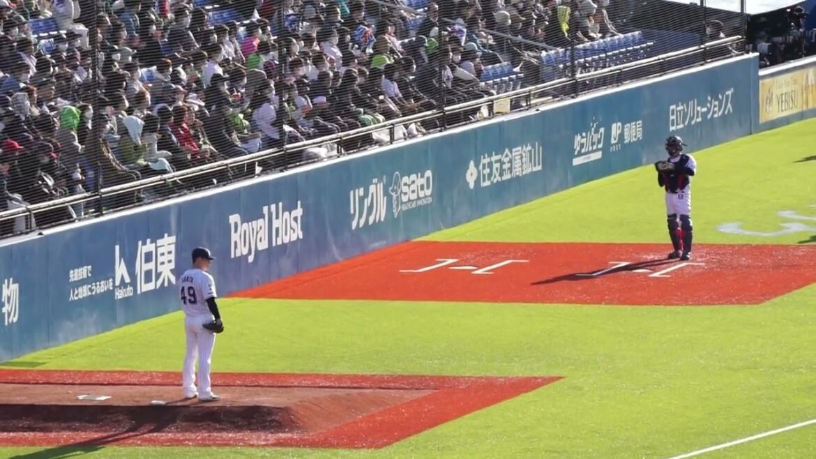 8回裏 成田翔投手がブルペンで投球練習を始める。