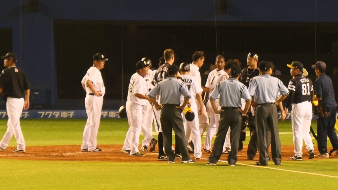 リック・バンデンハーク投手が清田育宏選手に死球を当ててしまい申し訳なさそうにしています