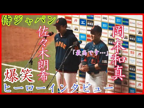 先発して3回無失点の最速165キロを計測した佐々木、7回に勝ち越しホームランを打った岡本のヒーローインタビューです。