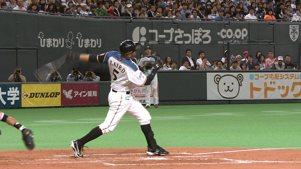3回、レアードが内角の打球を引っ張りレフトスタンドへの豪快なソロホームランとなった。 (6月11日 日本ハム-巨人)