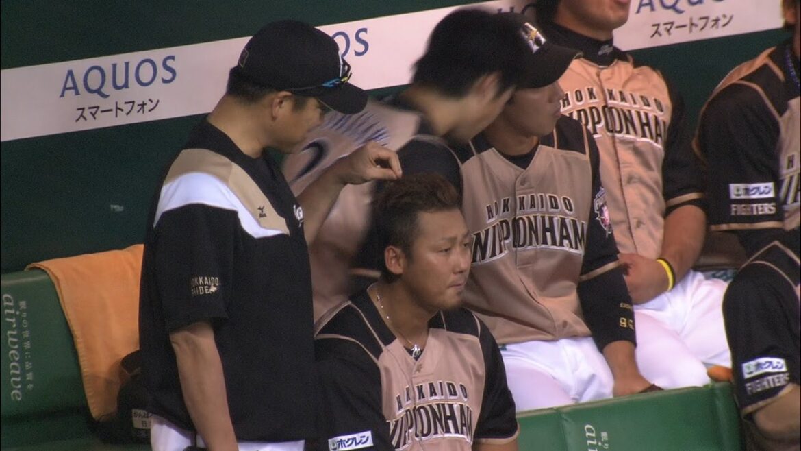 5回、ベンチにどっかりと座った主砲・中田翔のそばで髪の毛をねじり上げるようにしている中嶋聡コーチ。これは何かのおまじない?それとも何かのケア?いずれにせよ、大ベテランのコーチがこの試合はまだ快音の聞かれない主砲に独自のケアを施していた。(2014年10月19日 福岡ソフトバンクホークス対北海道日本ハムファイターズ)