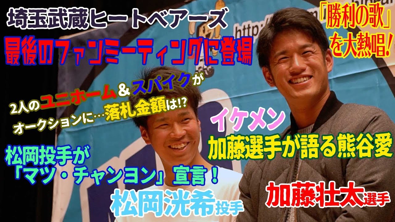 12月1日に埼玉県上尾市文化センターにてルートインBCリーグ・埼玉武蔵ヒートベアーズ選手会主催のファンミーティングクリスマス会が開催された。西武にドラフト3位指名された松岡洸希投手、巨人に育成2位指名された加藤壮太外野手がヒートベアーズの一員としては最後となるこのイベントに登場。貴重なスパイクとユニホームのオークションや、トークショーでファンを沸かせた。