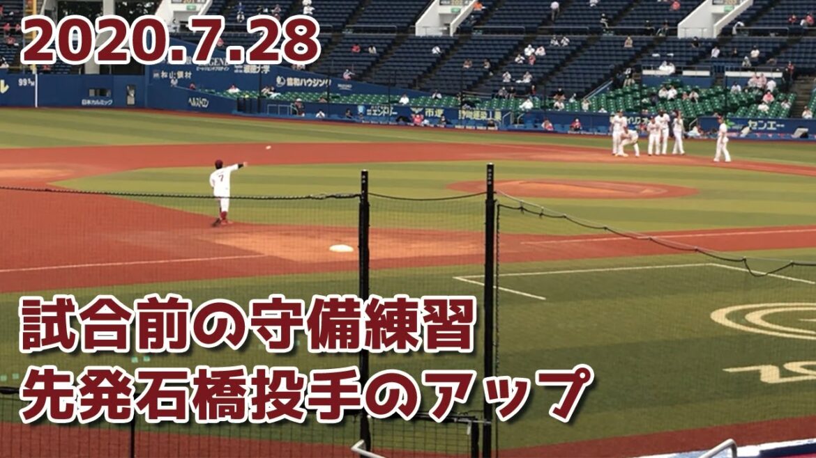 2020年7月28日にZOZOマリンスタジアムで開催された千葉ロッテマリーンズとの6連戦1戦目。楽天イーグルス先発・石橋良太投手のウォーミングアップと野手陣の試合前守備練習、1回裏の守備につくスタメン選手の映像です。