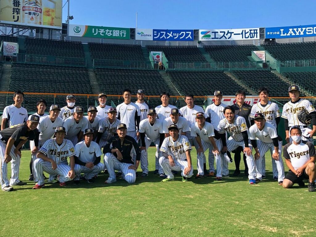 ファームは今日も甲子園でオリックス戦です! 練習前、桑原選手を囲んで投手陣で記念撮影 #桑原謙太朗 選手 #記念撮影 #阪神タイガース #挑超頂 Hanshin TigersHanshin Tigers Official MediaNPB Central LeagueOfficial Media挑超頂桑原謙太朗記念撮影阪神タイガース NPBHUB.COM | The Fanbase of Nippon Baseball & Nippon Professional Baseball