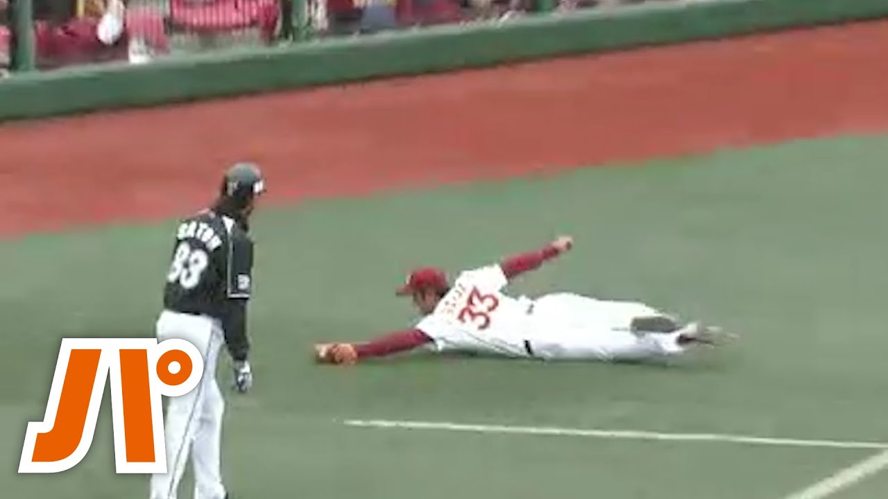 【名場面プレイバック】2012年4月1日 東北楽天と千葉ロッテによる一戦。3塁ファウルゾーンに上がった打球を銀次が懸命に追い掛け、ダイビングキャッチ。長い距離を走り、低空飛行で捕球という好プレーと見せた!!