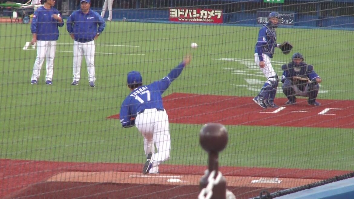 中日ドラゴンズ 柳裕也が試合開始前にブルペンで投球練習をしている映像。キャッチャー木下拓哉。2023年4月20日(木) 神宮球場、ヤクルト vs 中日。