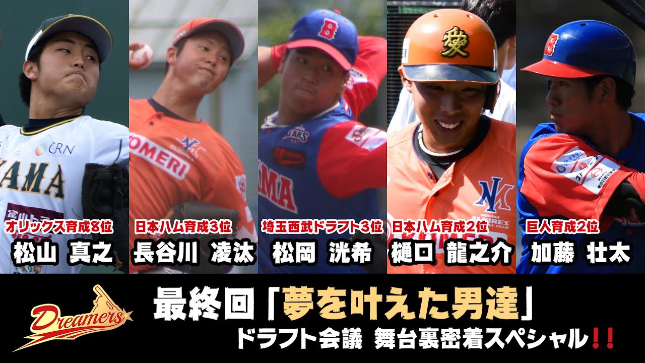 2019年プロ野球ドラフト会議。独立リーグ・ルートインBCリーグ指名選手の舞台裏に密着。西武ライオンズからドラフト3位指名を受けた松岡洸希、読売ジャイアンツから育成2位指名を受けた加藤壮太。日本ハムファイターズから育成3位指名で長谷川凌汰。夢を追い続けた男達が夢を叶える瞬間に密着した。